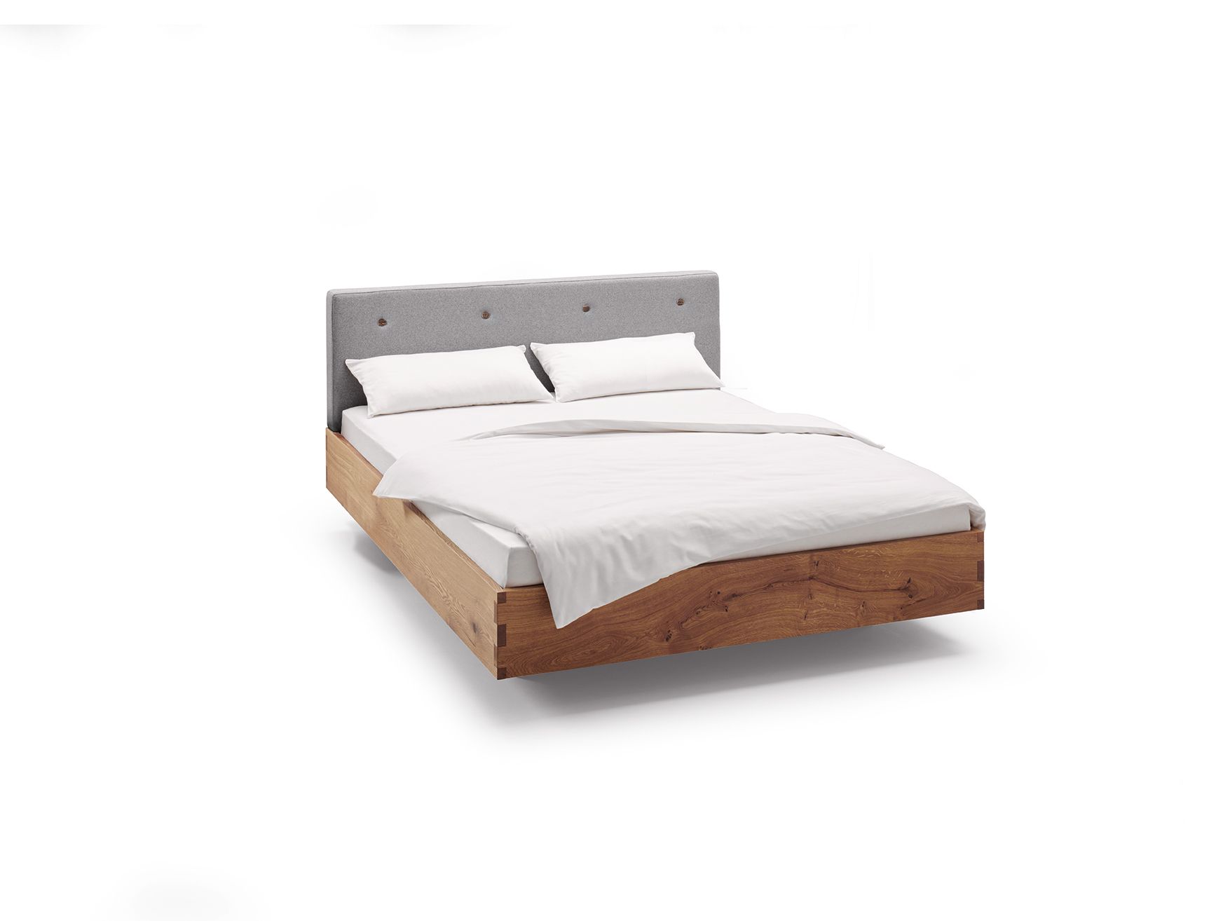 Das Bett hat eine Höhe von 35 cm und wahlweise ein 81 cm hohes Kopfteil aus Massivholz oder eine Polster-Rückenlehne, die an einem niederen Kopfteil befestigt ist. Besonders charmant ist die Version mit grauem Polsterstoff und einer Steppung mit Hirschornknöpfen. An beiden Bettvarianten können seitliche Winkelablagen mit oder ohne Schubkastenangebracht werden.